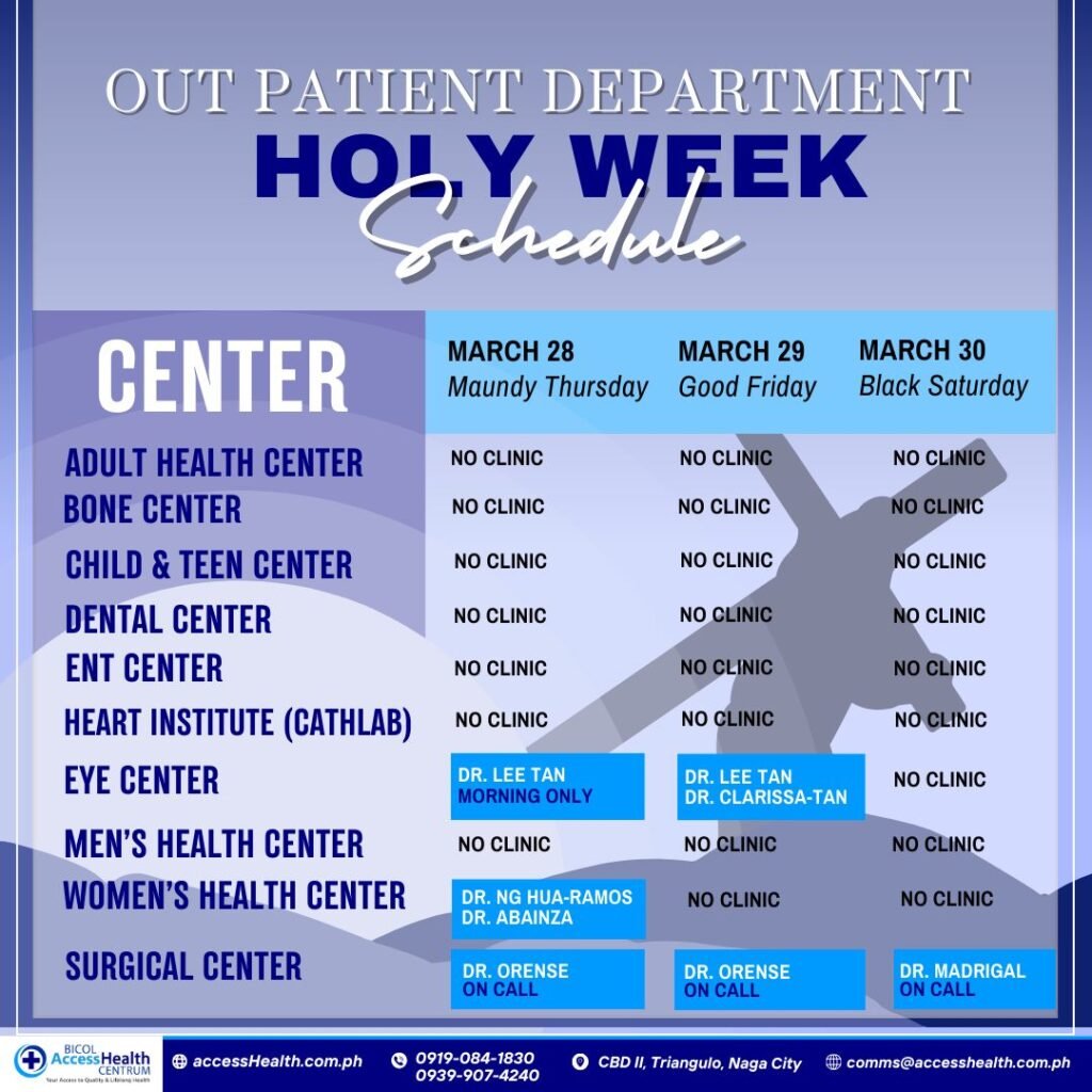 Dear Valued Patients, During Holy Week, please take note of our updated schedule. We encourage everyone to spend this time in reflection, renewal, and connecting with your family and God. Remember to prioritize your health and safety during this solemn season. Wishing you a blessed Holy Week filled with peace, hope, and spiritual connection.