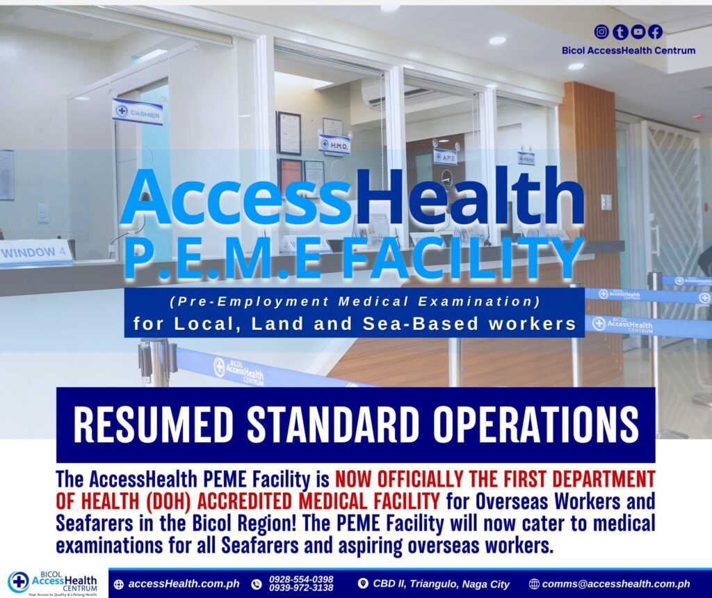 The AccessHealth PEME Facility is NOW OFFICIALLY THE FIRST DEPARTMENT OF HEALTH (DOH) ACCREDITED MEDICAL FACILITY for Overseas Workers and Seafarers in the Bicol Region! The PEME Facility will now cater to medical examinations for all Seafarers and aspiring overseas workers. For any concerns or inquiries, please contact : 0928-554-0398 or 0939-972-3138. Visit us at […]
